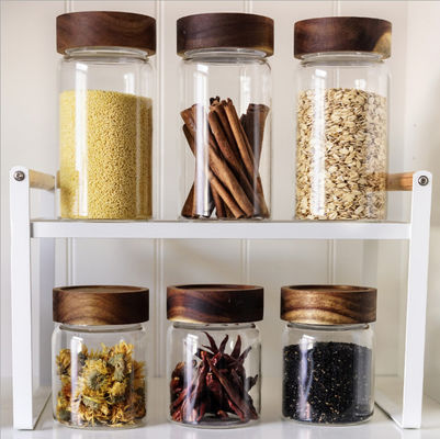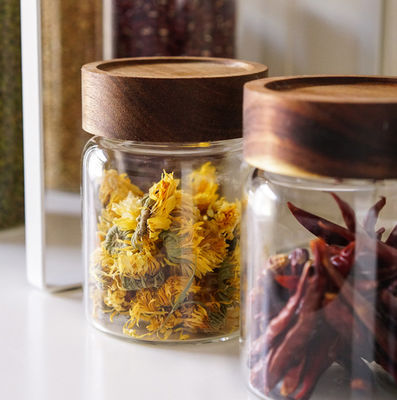 ইকো ফ্রেন্ডলি ডিস্ক টপ গ্লাস জার খালি কাঠের ঢাকনা পরিষ্কার রান্নাঘরের ক্যানিস্টার স্বচ্ছ কাচের জার